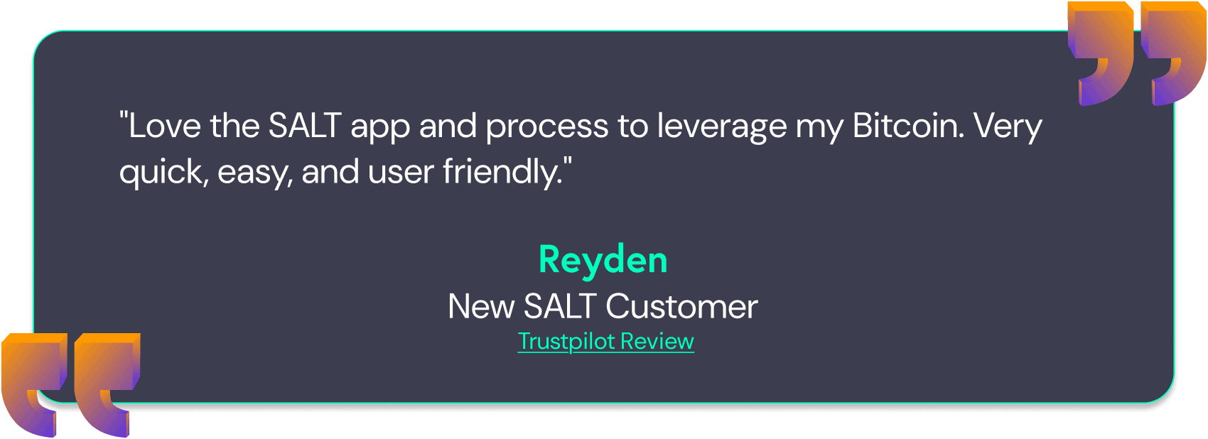 Trusted by thousands of customers since being founded, SALT Lending has been a leader in the world of Bitcoin-backed loans. We’ve helped people access cash quickly, securely, and with competitive rates — all while putting your Bitcoin assets to work for you, so you never have to sell your digital gold!