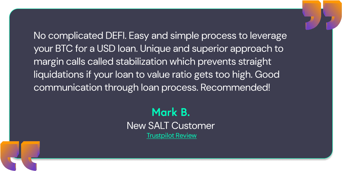 Trusted by thousands of customers since being founded, SALT Lending has been a leader in the world of Bitcoin-backed loans. We’ve helped people access cash quickly, securely, and with competitive rates — all while putting your Bitcoin assets to work for you, so you never have to sell your digital gold!