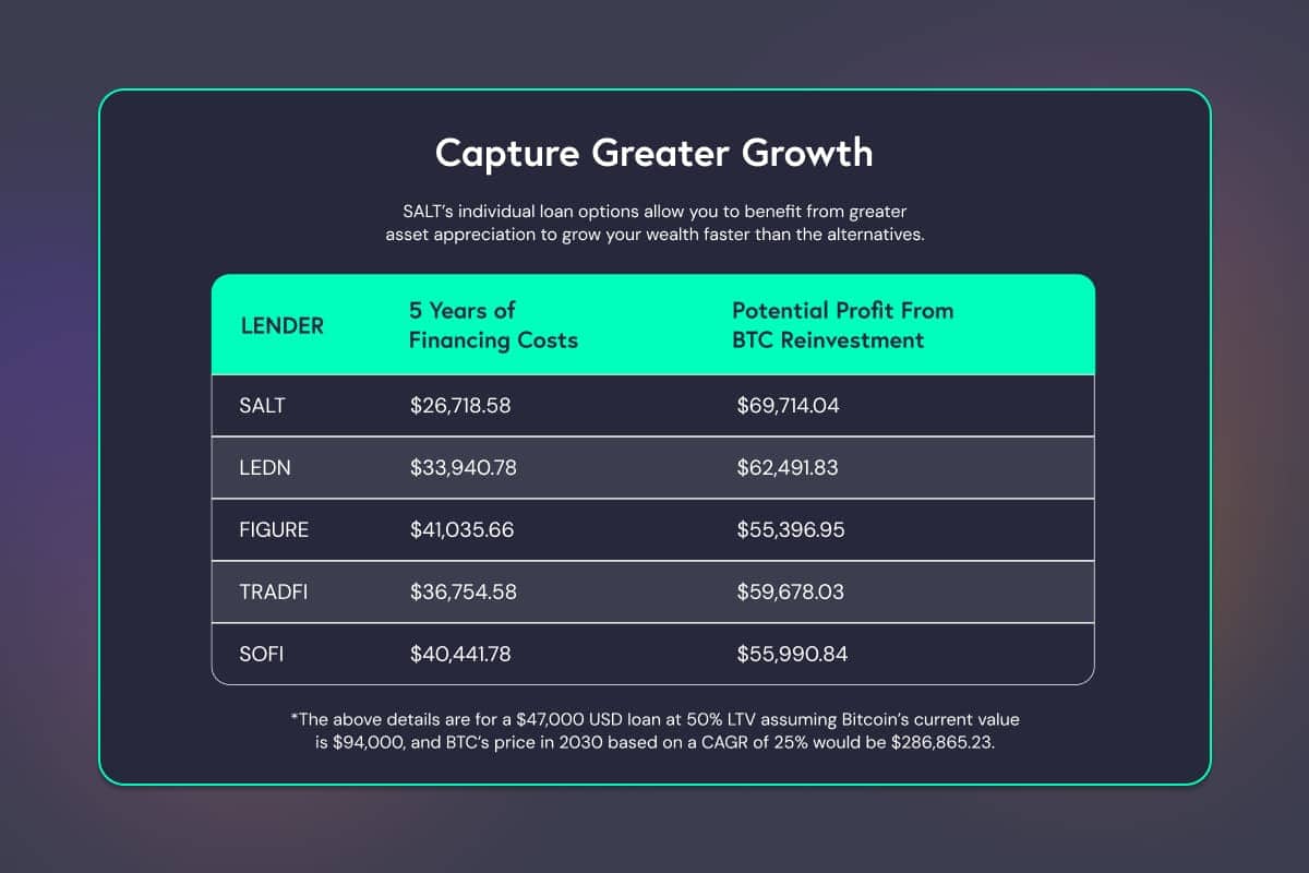 Bitcoin has delivered an average annual return of ~49% over the last decade (E*Trade). Even if future returns are lower, Bitcoin’s scarcity and adoption trajectory suggest long-term growth. Paying 8.95%–14.45% APR on a loan (SALT’s standard range) is a small price to preserve upside.